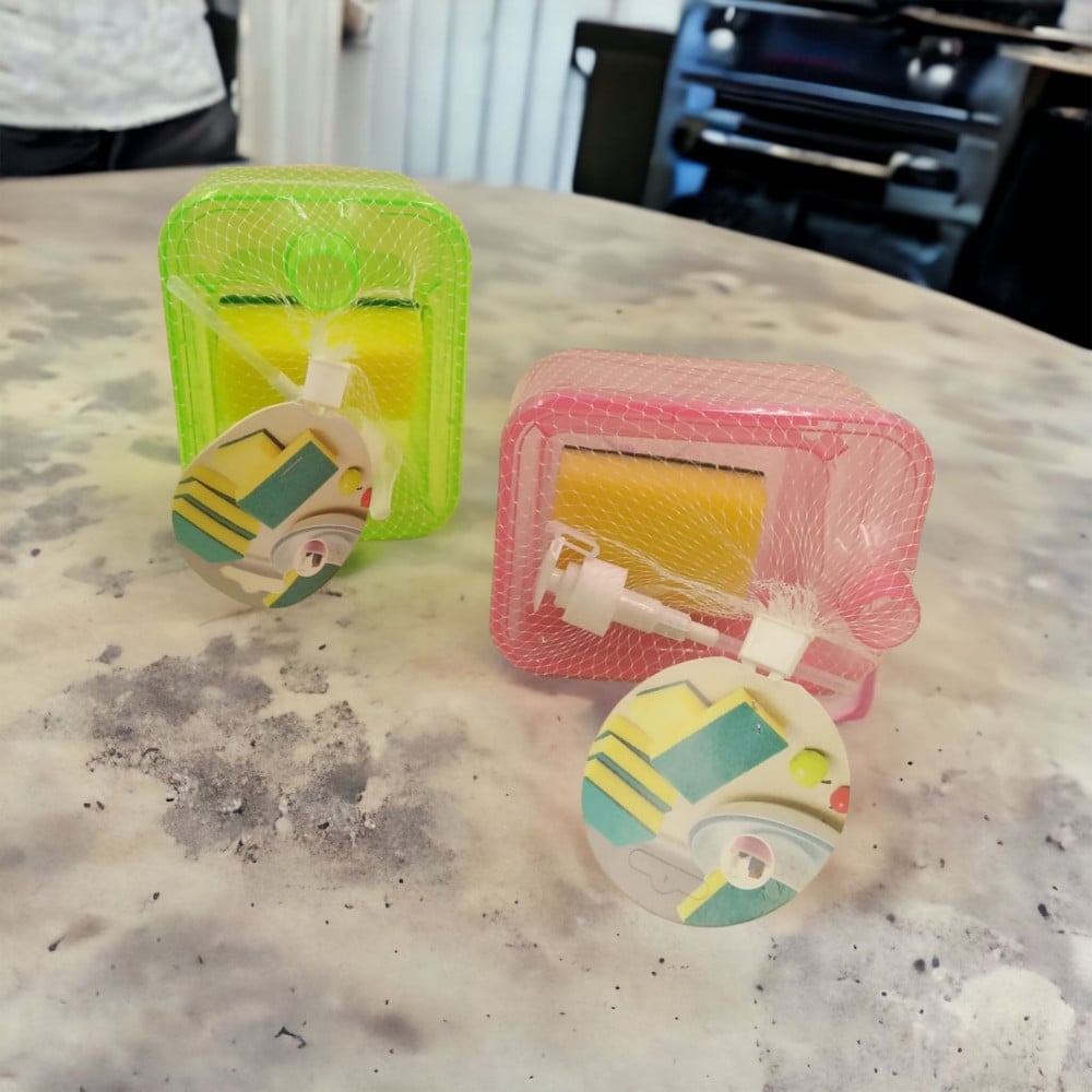 منتج يتم من خلاله توزيع كمية مثالية من سائل غسيل الصحون على الإسفنجة، اضغط على الضغاط العلوي لتوزيع الصابون مباشرة على الإسفنجة وتوزيع السائل بسهولة وتحافظ على الإسفنجة في مكانها.