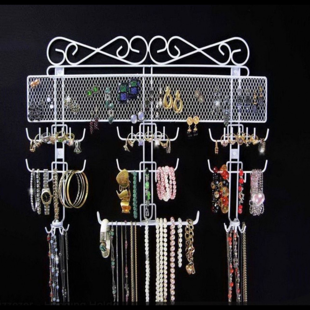- حامل مجوهرات معدني باللون الابيض لترتيب القلائد، وأساور اليدين وأقراط الأذنين وغيرها.